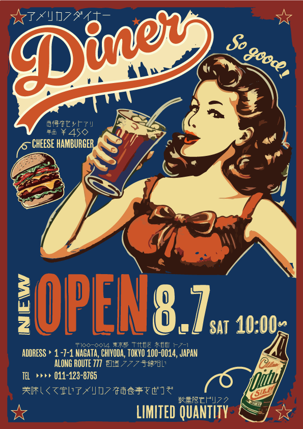 レトロアメリカンの雰囲気が大好きなので、新規オープンを告知するポスターを想定して制作しました。illustratorのみで制作。